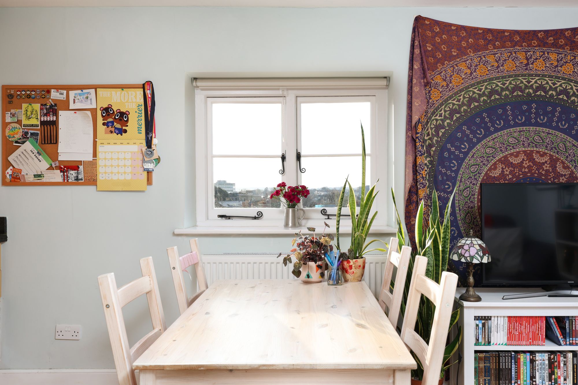 Inside, the hallway provides a welcoming entry point with space to hang coats and room for storage furniture to keep everyday items neatly organised. From here, a doorway opens into the open plan kitchen and living room. Wooden cabinetry and dark worktops provide ample kitchen storage as well as housing integrated appliances, while a window frames far-reaching views across Bristol. The layout offers space for both a lounge area and dining table, making the room practical and sociable.