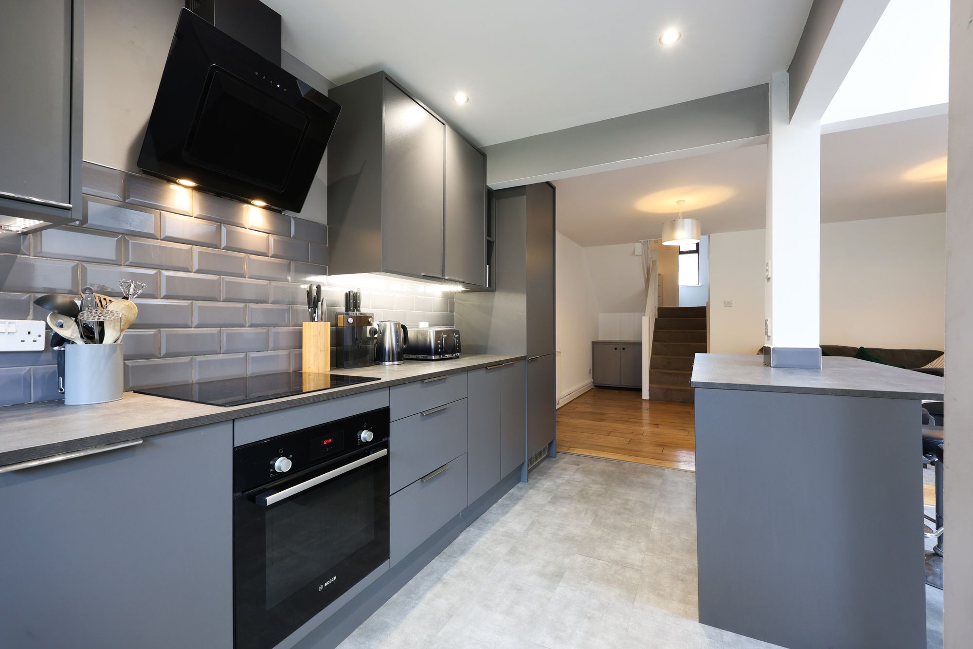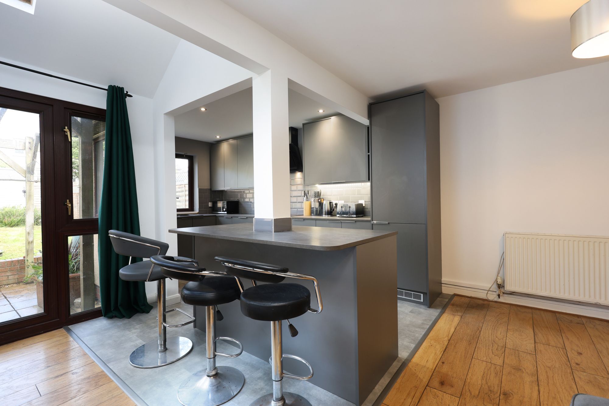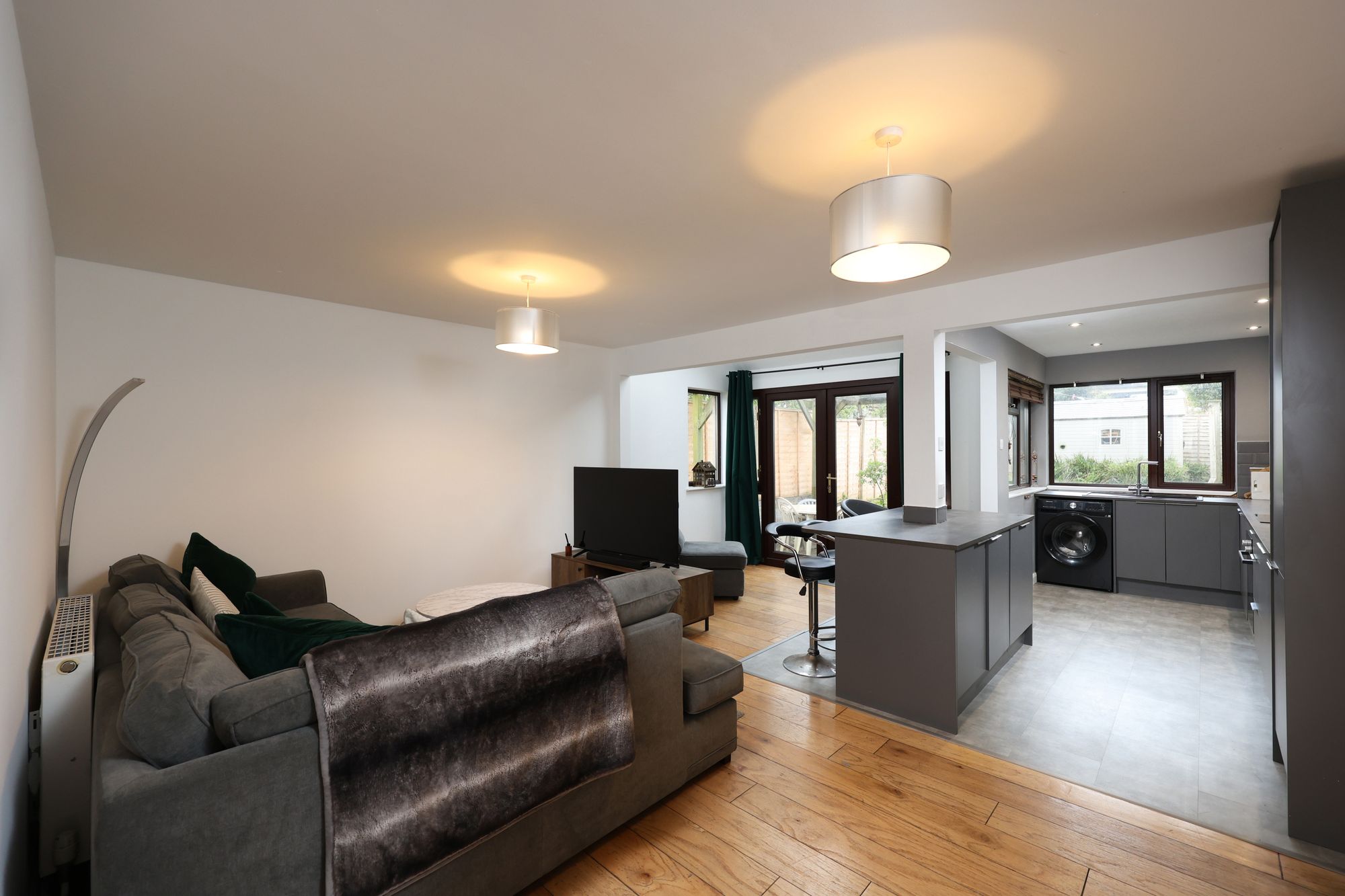 The accommodation comprises a main entrance leading into a generous hallway with a useful W/C and storage cupboard located off of the hall. At the front of the property, bedroom two is a well-proportioned double and is complete with en-suite shower room and built-in wardrobe. Steps lead down into a large open-plan kitchen/living/dining space perfect for families and socialising. The recently renovated kitchen incorporates a central island/breakfast bar and is fitted with a range of sleek wall and base units with contrasting worktops, metro style tiled splash-backs and an array of integrated appliances. Dual aspect windows allow for plenty of natural light and provide a pretty view over the rear garden. The seating area has ample space for a large sofa, whilst a set of patio doors provide a seamless connection to the patio and rear garden.