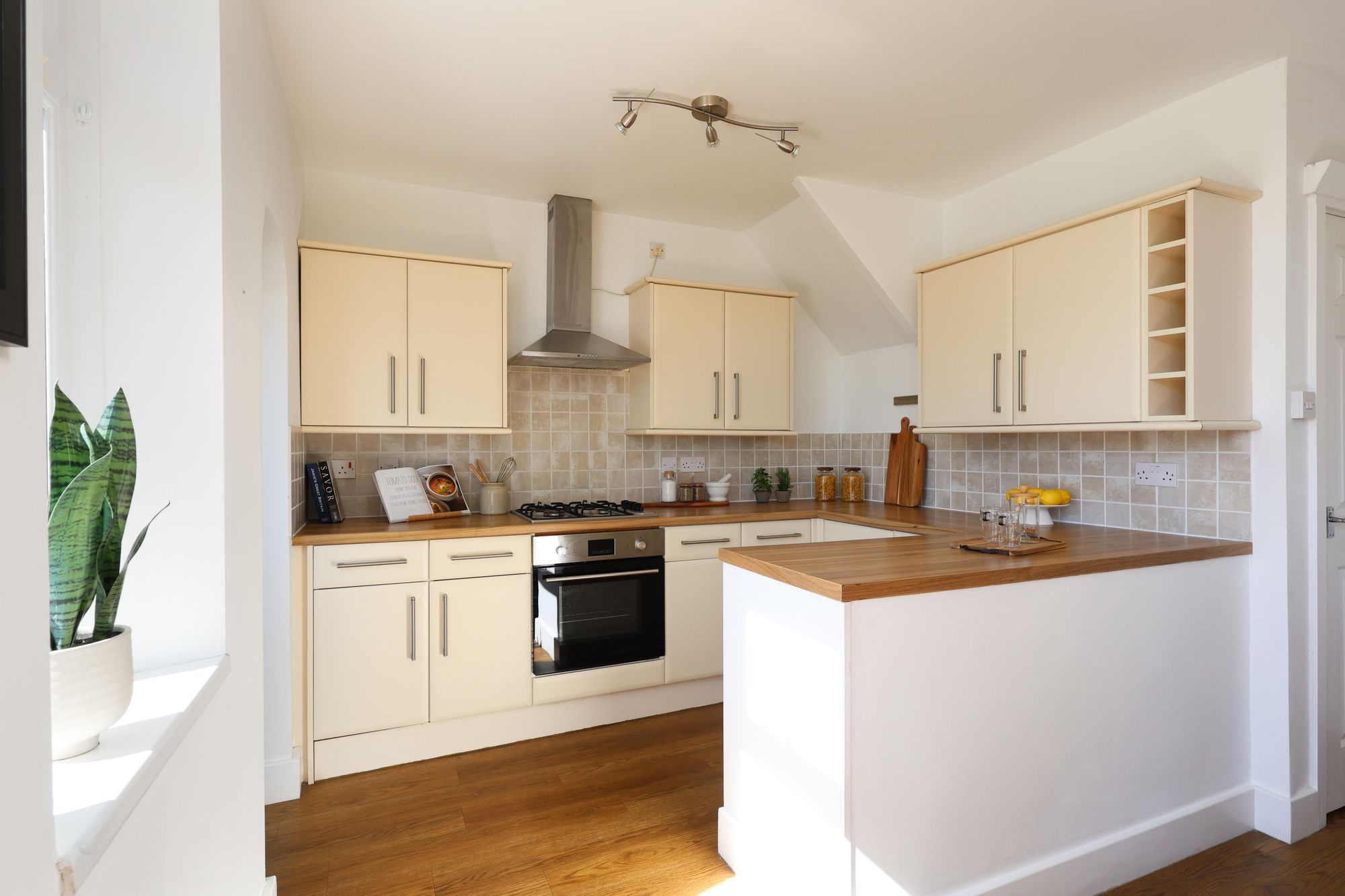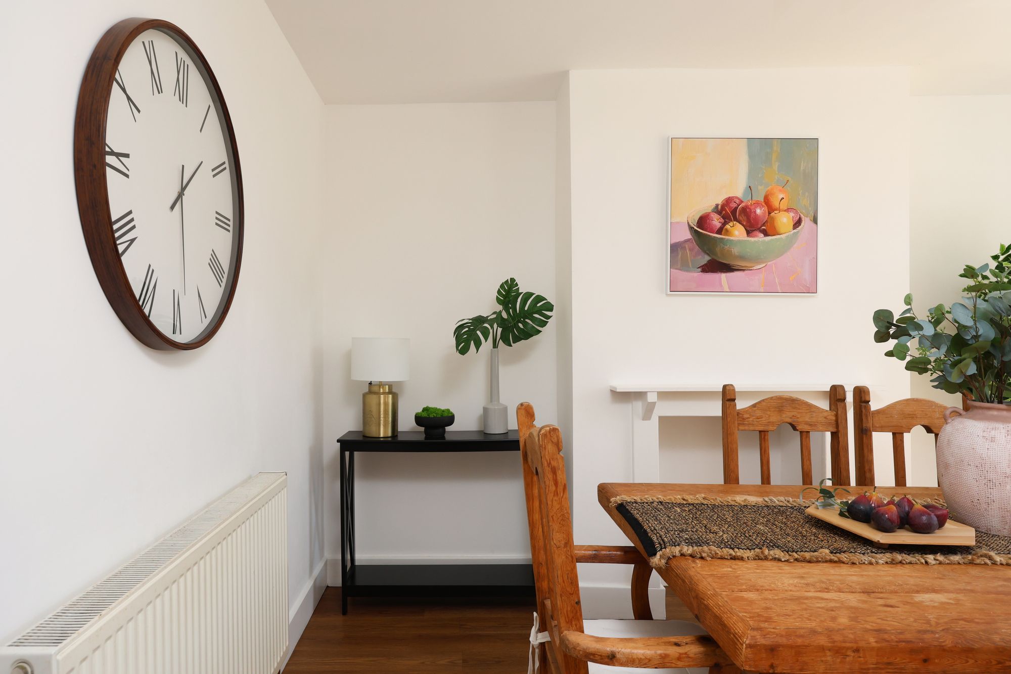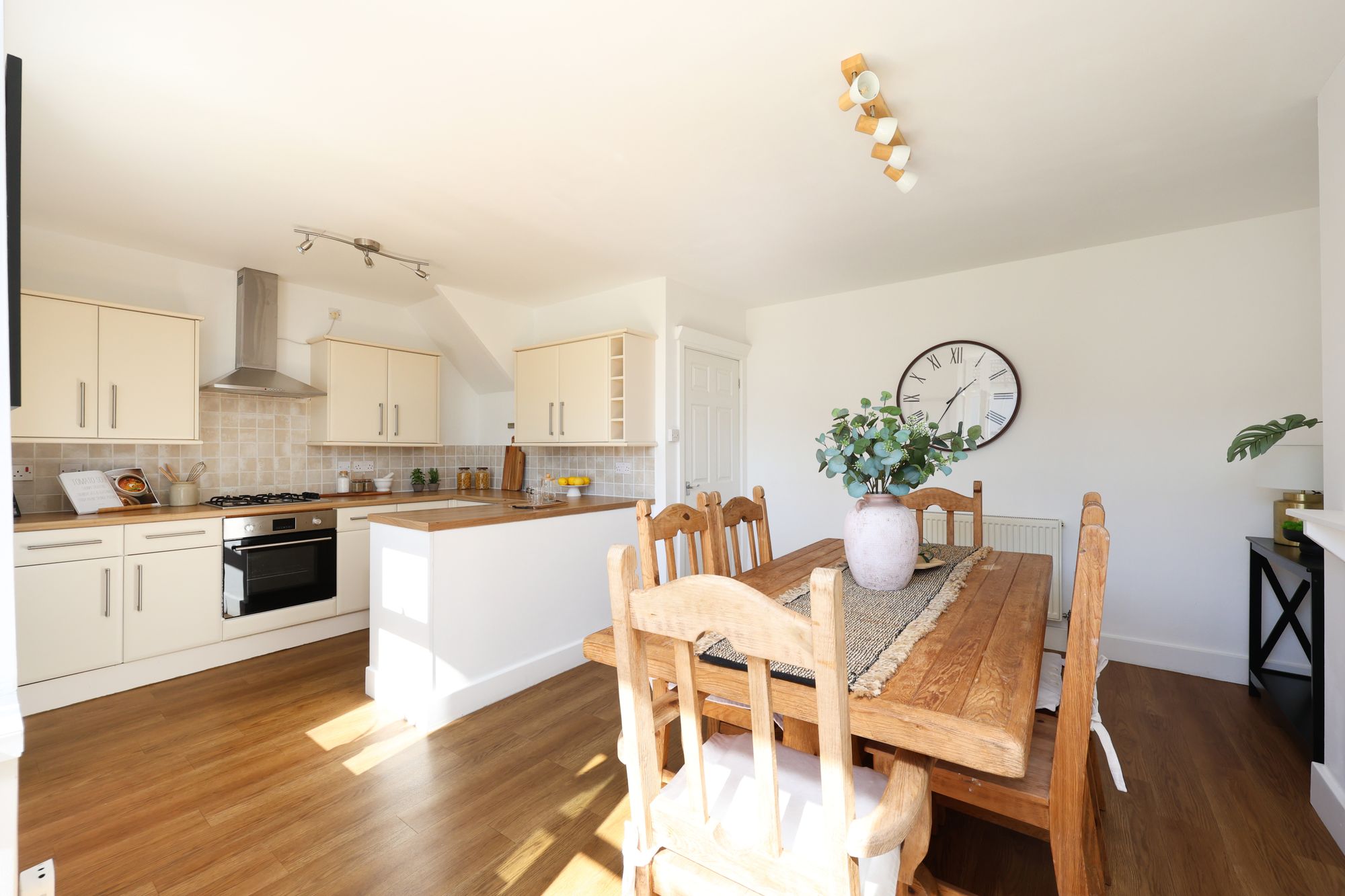 At the rear of the property, the open plan kitchen / diner has been created to offer the perfect space for families and socialising with a seamless connection to the garden via a set of patio doors that lead out onto the generous decked terrace. The kitchen has been tastefully finished with a range of shaker style wall and base units with contrasting solid wood work surfaces, tiled splash-back and some integrated appliances. The dining area has ample space for a large table and chairs, whilst an open fireplace provides the main focal point for the room. Beyond the kitchen is a useful separate utility room with stainless steel sink and a glazed door the provides further access out onto the rear garden.