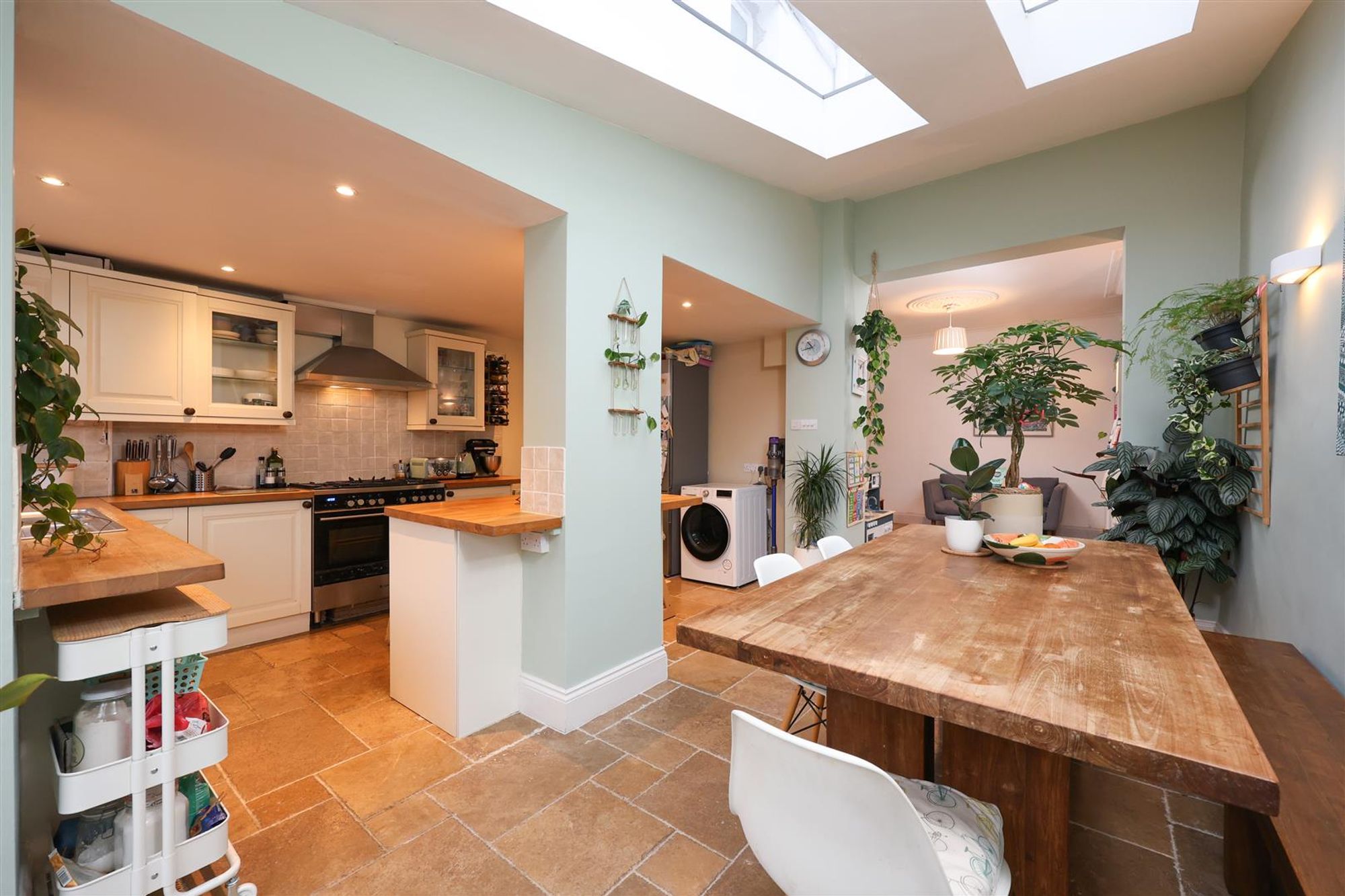 Next door, the second reception room is currently used as a family/music room and connects seamlessly to the kitchen/diner via an open arch. Benefits include an original fireplace with striking tiled surround and hearth, ceiling rose/cornice and further fitted storage. The rear of the property has been extended in order to create a light and bright open plan kitchen/diner with bi-folding doors providing direct access out onto the rear garden. The kitchen has been tastefully designed around a central island/breakfast bar and is fitted with a range of shaker style wall and base units with contrasting solid wood work surfaces. Recessed spotlights, tiled splash-backs and a tiled floor complete the overall look. The dining area has ample space for a large table and chairs, whilst twin roof lights allow for plenty of natural light.