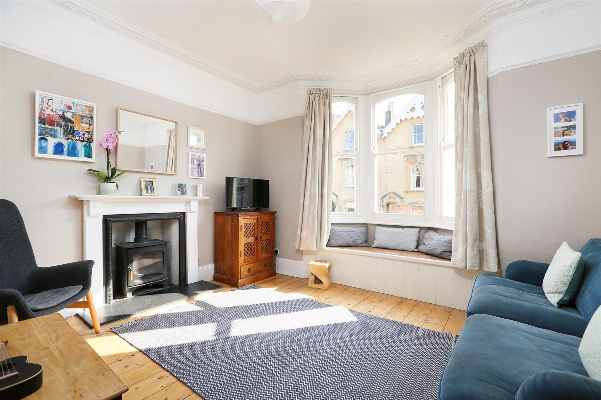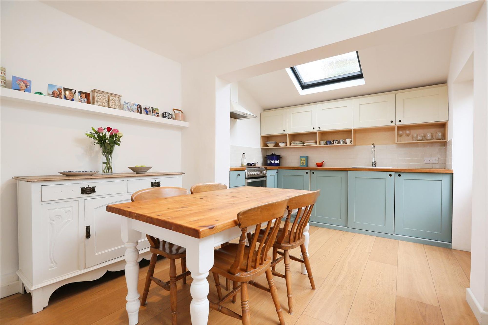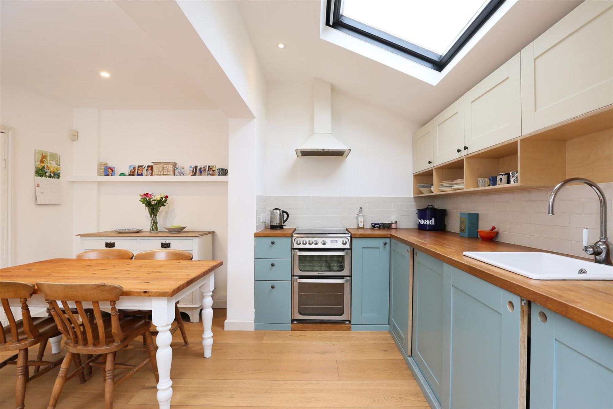 The accommodation on the ground floor comprises a living room at the front with a bay with sash windows and a built-in seat. The original cornice, picture rail and floorboards have been retained while a cast iron multi-fuel burner has been added as a focal point to the room. The central hallway leads into a rear reception room which also has a bay with original sashes facing the side aspect. This room also has period character with coving, picture rail and a stripped wood floor. An archway leads into to a kitchen dining space at the rear of the house which provides access into the garden. The kitchen is fitted with a range of contemporary shaker style units with a solid work top and ceramic sink. There is plenty of space for a dining table and plenty of natural light from the velux window, large sash and glazed doors. A doorway at the rear of the room connects back to the main hallway with a useful storage built-in under the stairs and a butlers pantry with the original solid wood dresser.