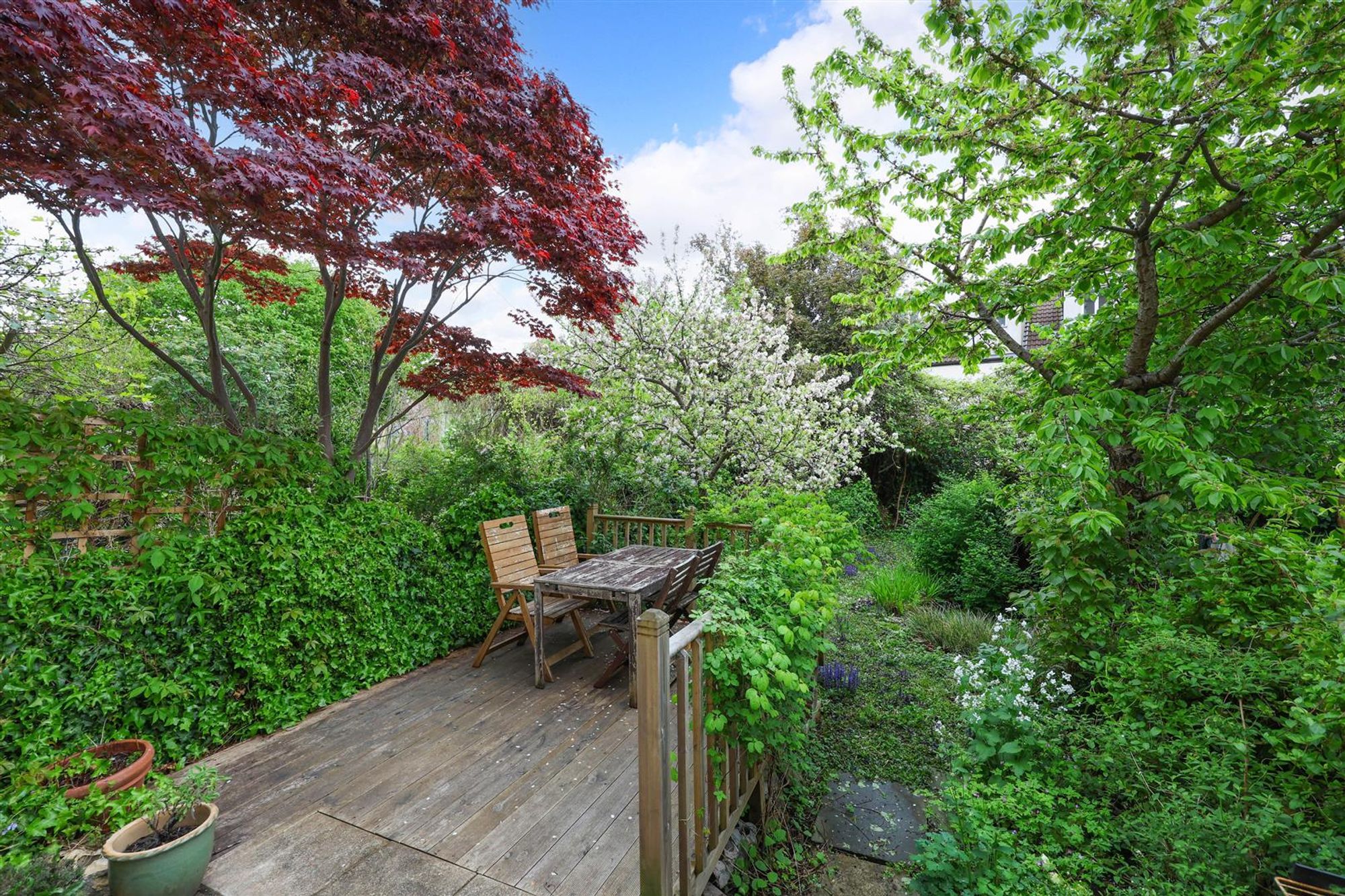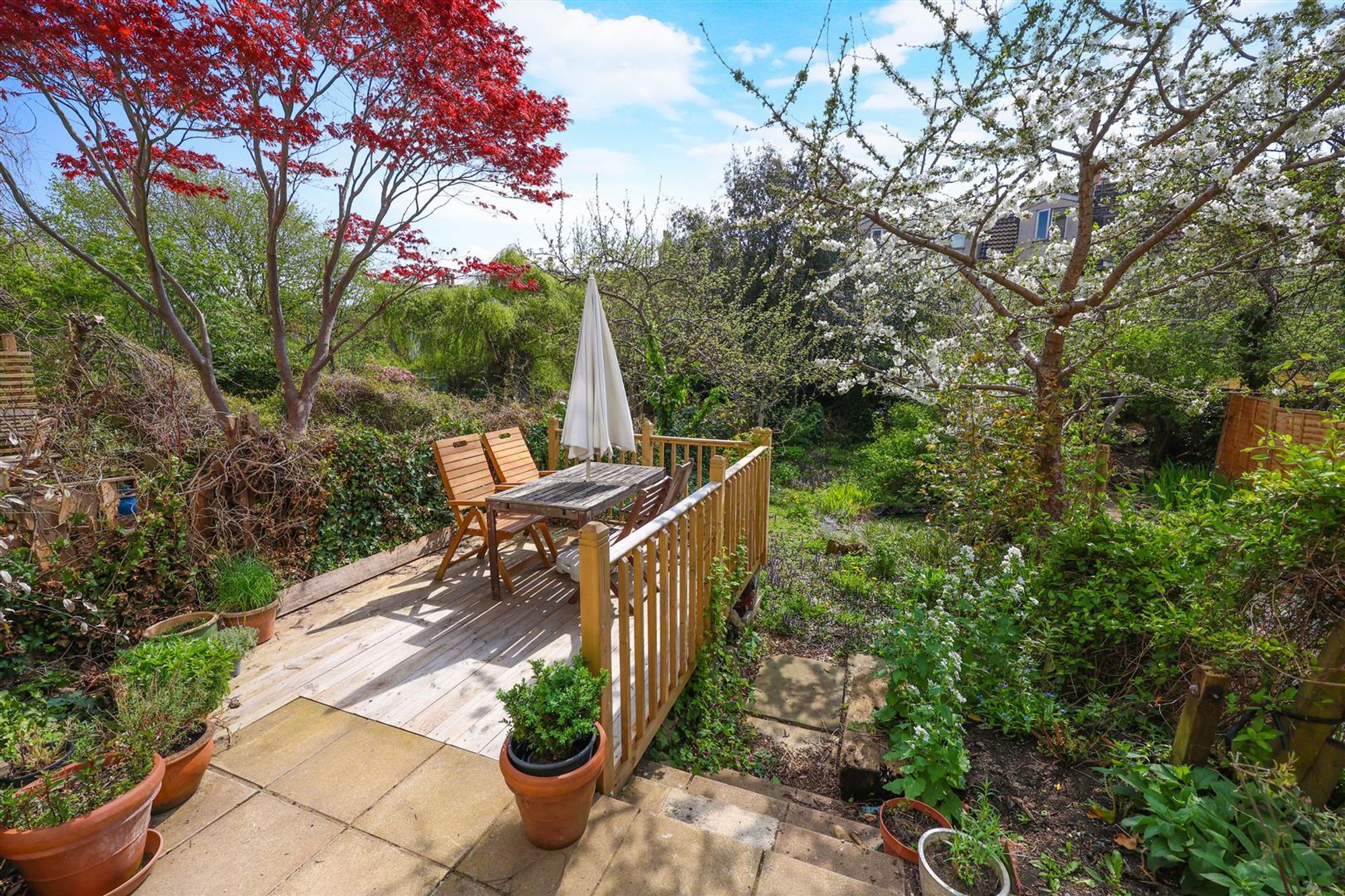 The garden features a raised patio seating area with room for a table and chairs, stairs that lead down to the lower part of the garden which is lawned and has a small pond.
