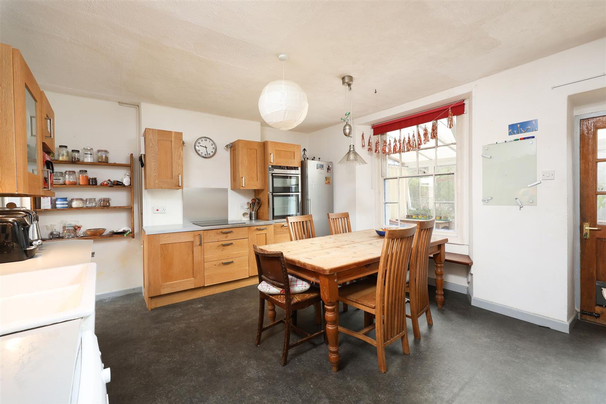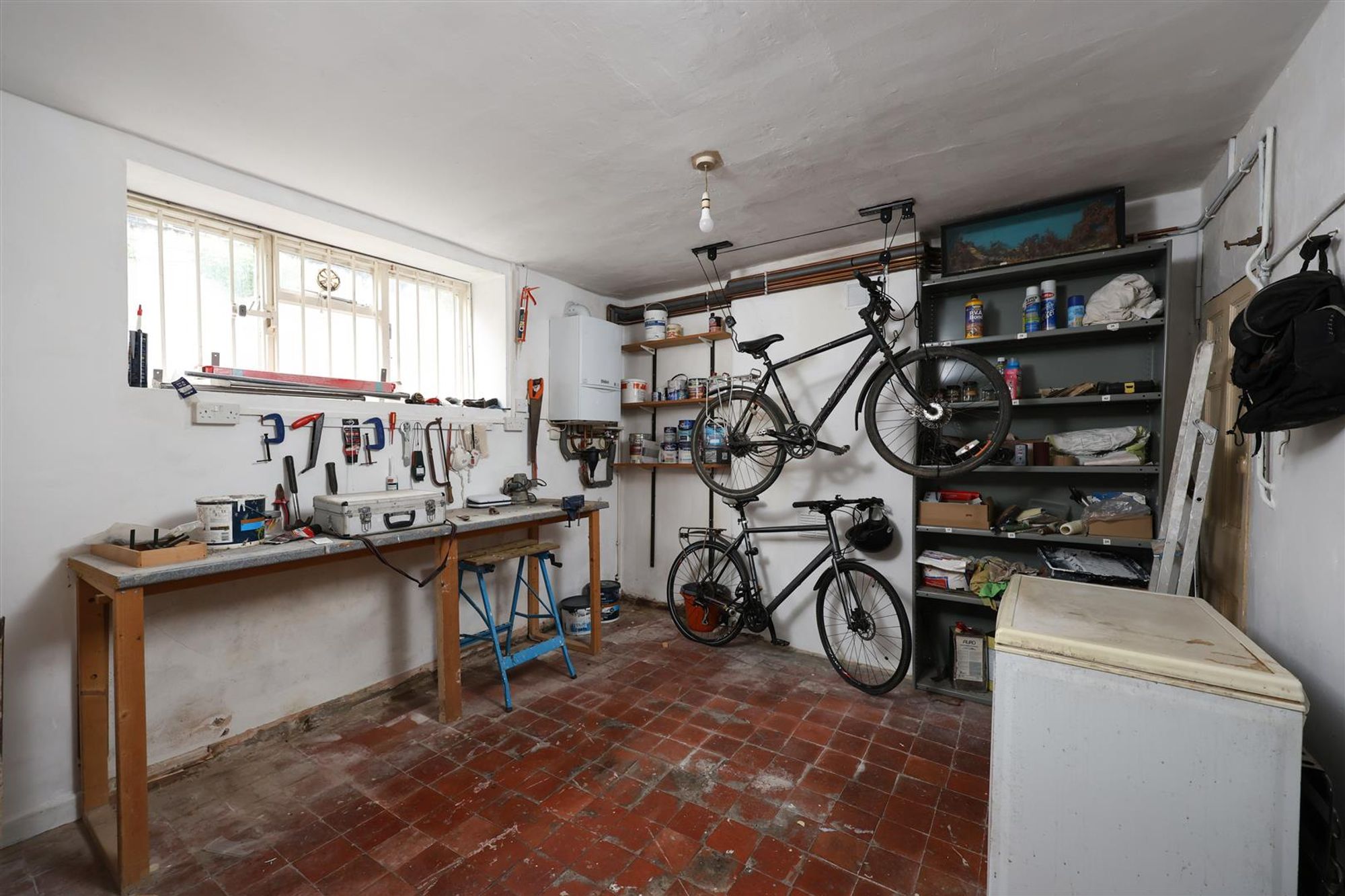On the lower ground floor, you find the workshop and the open-plan kitchen diner. The kitchen features a range of solid wood wall and base units with contrasting worktops, the room is big enough for a large table and chairs and features a window seat with views out to the garden.